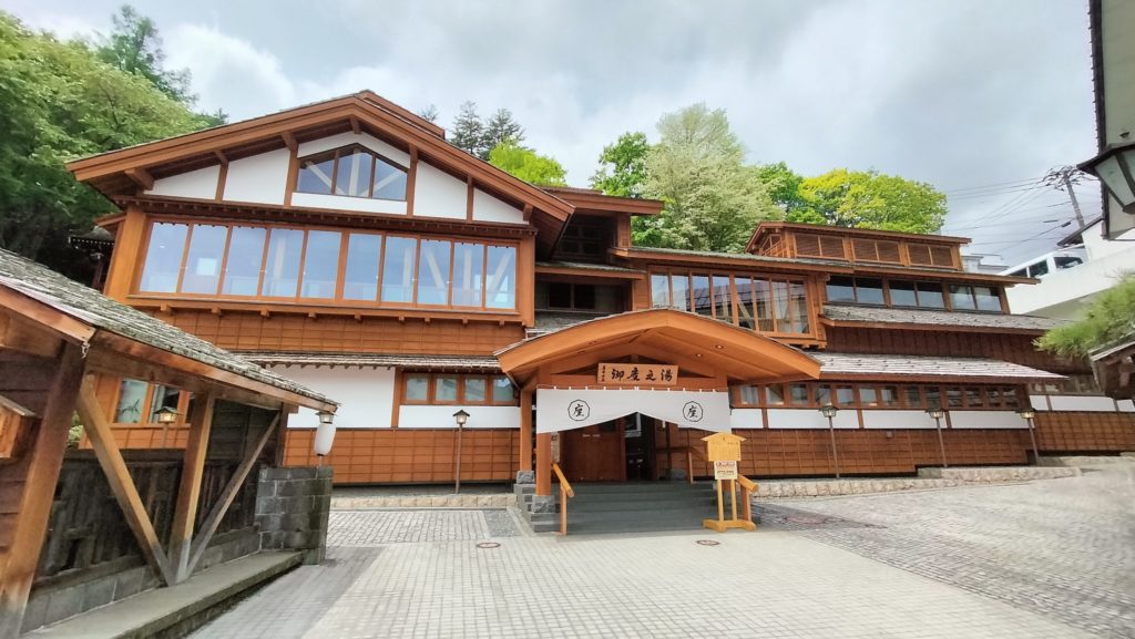 草津温泉のシンボル「湯畑」の目の前に建つ、有料の日帰りの温泉施設です。