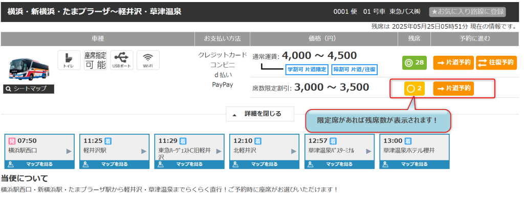 楽天トラベルでも高速バスの予約は可能ですが、この「限定4席」は発車オーライネット限定の取り扱いのようです。