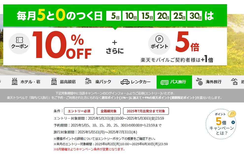 高速バス(直行) 楽天トラベルクーポン使用約5時間7分4,050円(通常料金)なし0回クーポンは先着順
